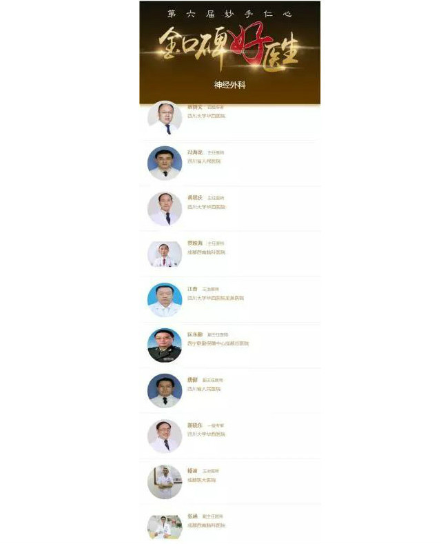9月25日,由成都商报主办、成都商报四川医生承办、四川省预防医学会指导的 “第六届妙手仁心·金口碑好医生”评选“好医生专科专病榜十强”名单出炉!我院教授、张涵博士双双荣获“金口碑”好医生评选“神经外科十强”。
