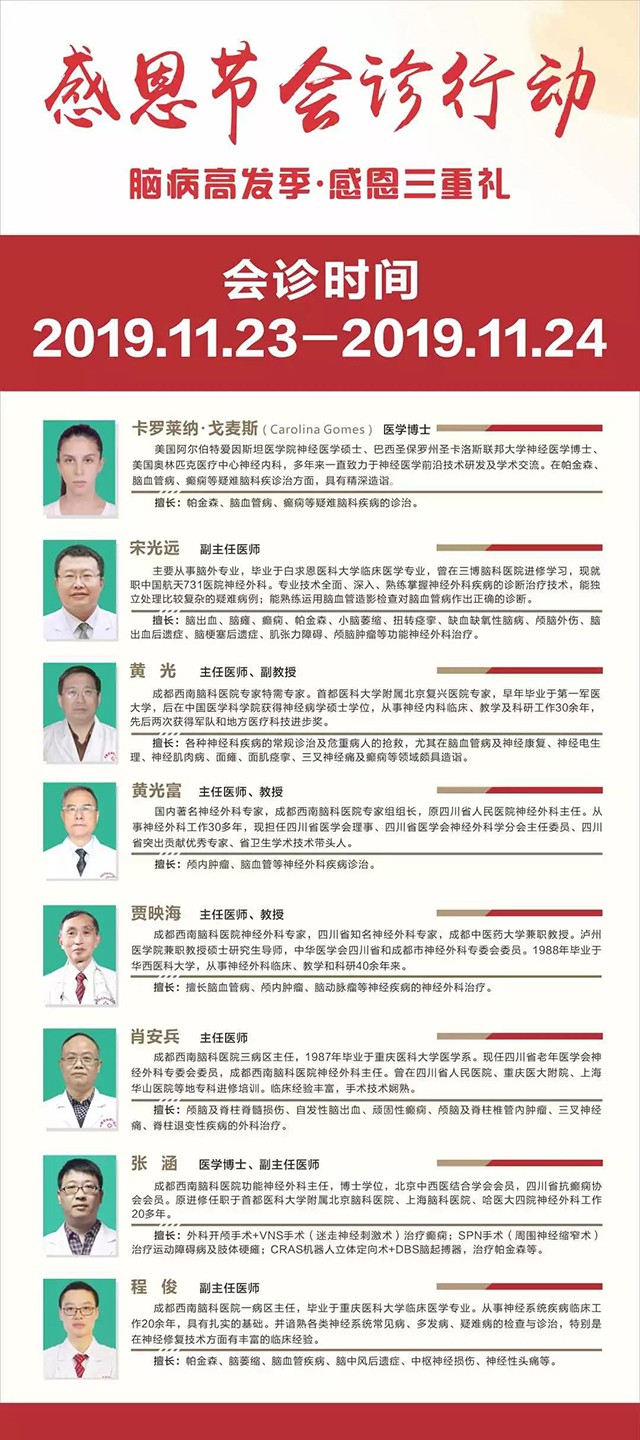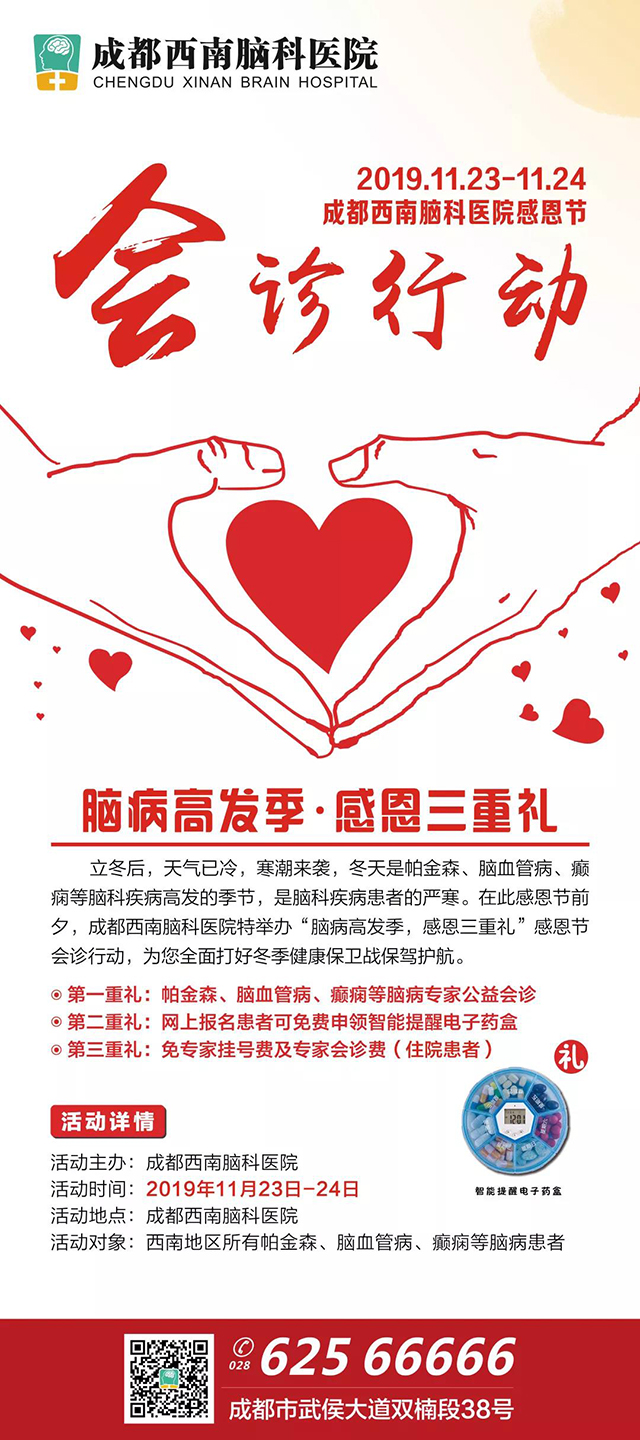 每年11月的第四个星期四是一年一度的感恩节。今年感恩节是11月28日。我们心存感恩!感恩患者,选择西南脑科,并给予我们的信任!正值感恩节来临之际,成都西南脑科医院特举办“脑病高发季,感恩三重礼”感恩节会诊活动,助您多方面打好冬季健康保卫战!