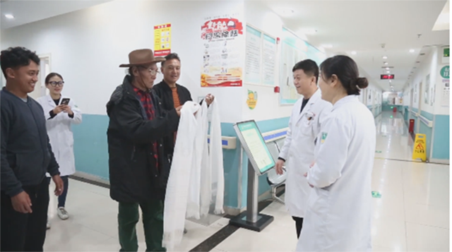 术后,患者肢体抖动症状消失,身体活动灵活度提高,卧床、起身、走路等轻松了许多。看到治治疗果如此明显,患者和家属非常满意。12月11日,他们专程送来哈达献给张涵博士、神经内科张平主任和三病区徐群策医生,感谢医生们的热心帮助和用心治疗。
