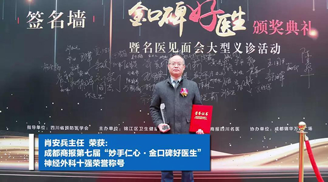 成都西南脑科医院先后获得由四川省预防医学会、成都商报传媒集团及成都商报四川医生联合颁发的“2019健康科普示范单位”、由崇州市怀远镇人民政府及成都电视台都市生活频道新闻中心联合颁发的“公益扶贫爱心单位”。成都西南脑科医院一病区程俊主任荣获华西都市报主办的第七届“榜样中国,我心中的医生”神经内科十大医生荣誉称号、成都西南脑科医院三病区肖安兵主任荣获成都商报主办的第七届“妙手仁心·金口碑好医生”神经外科十强荣誉称号……我们在荣誉中审视自我,并坚定前行。