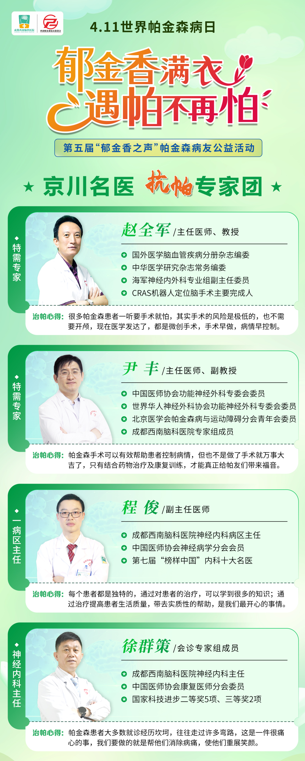今年的4月11日是第26个世界帕金森日,为引导公众正确认识帕金森疾病,树立战胜疾病的信心,我院将开展“郁金香满衣,遇帕不再怕”帕金森病友公益活动,启动“春暖花开,情系帕友”家访公益行,组织医护团队走进帕金森患者的生活,给予帕金森患者更多实质性的帮助。