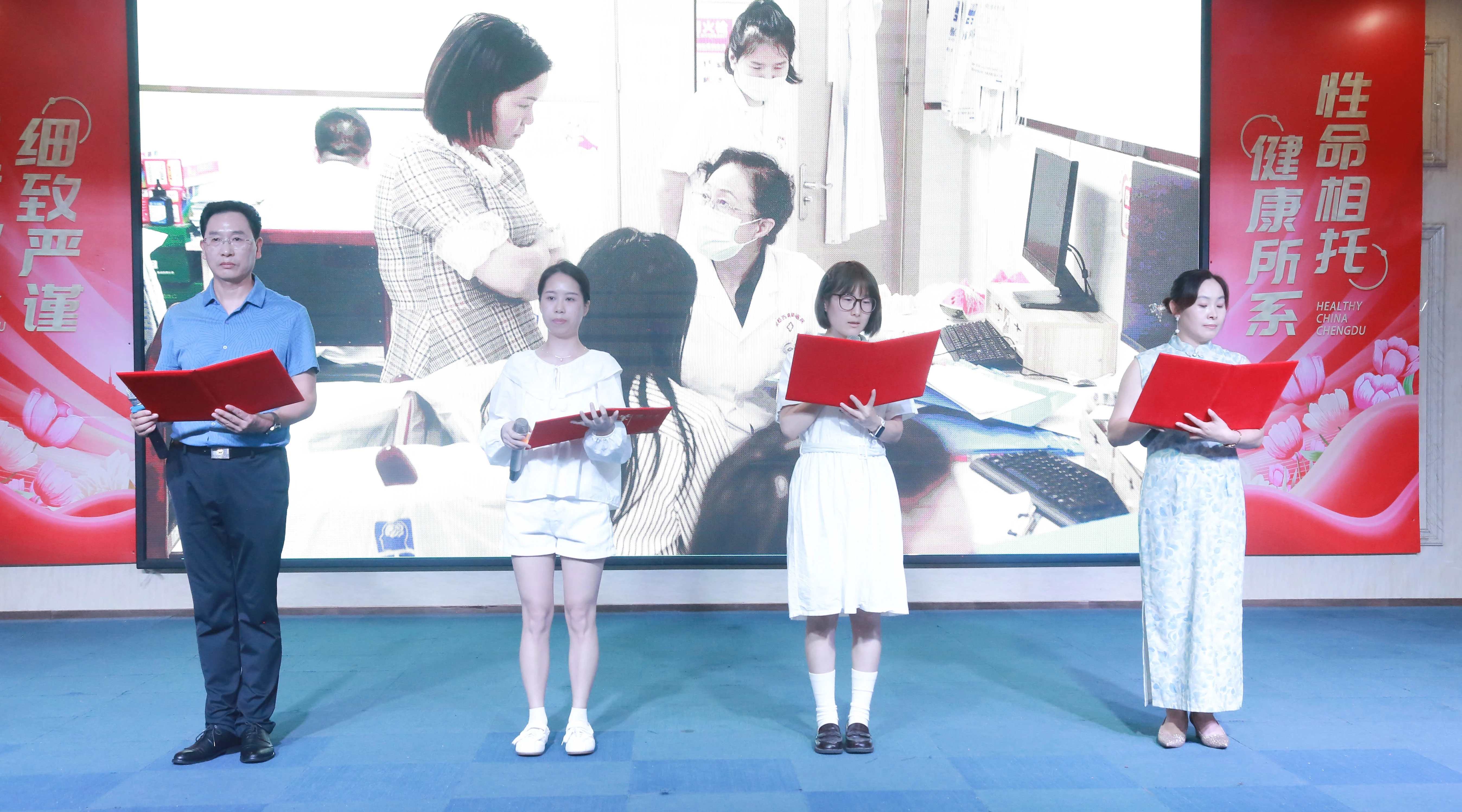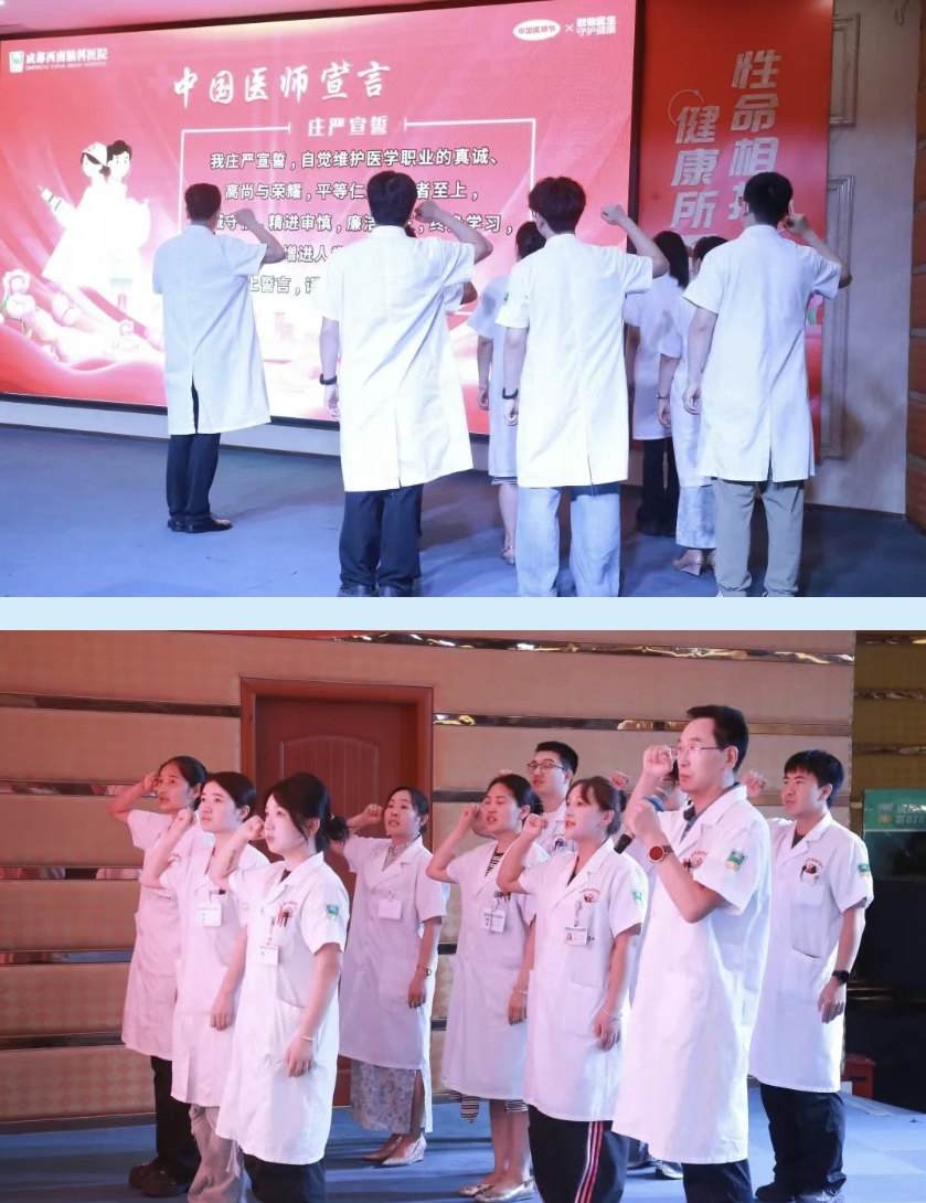 随后,在杨勤光医生的领誓下,十余位医生代表高举右手握拳,庄声宣誓,表达了他们投身医疗事业,维护医学圣洁的决心。