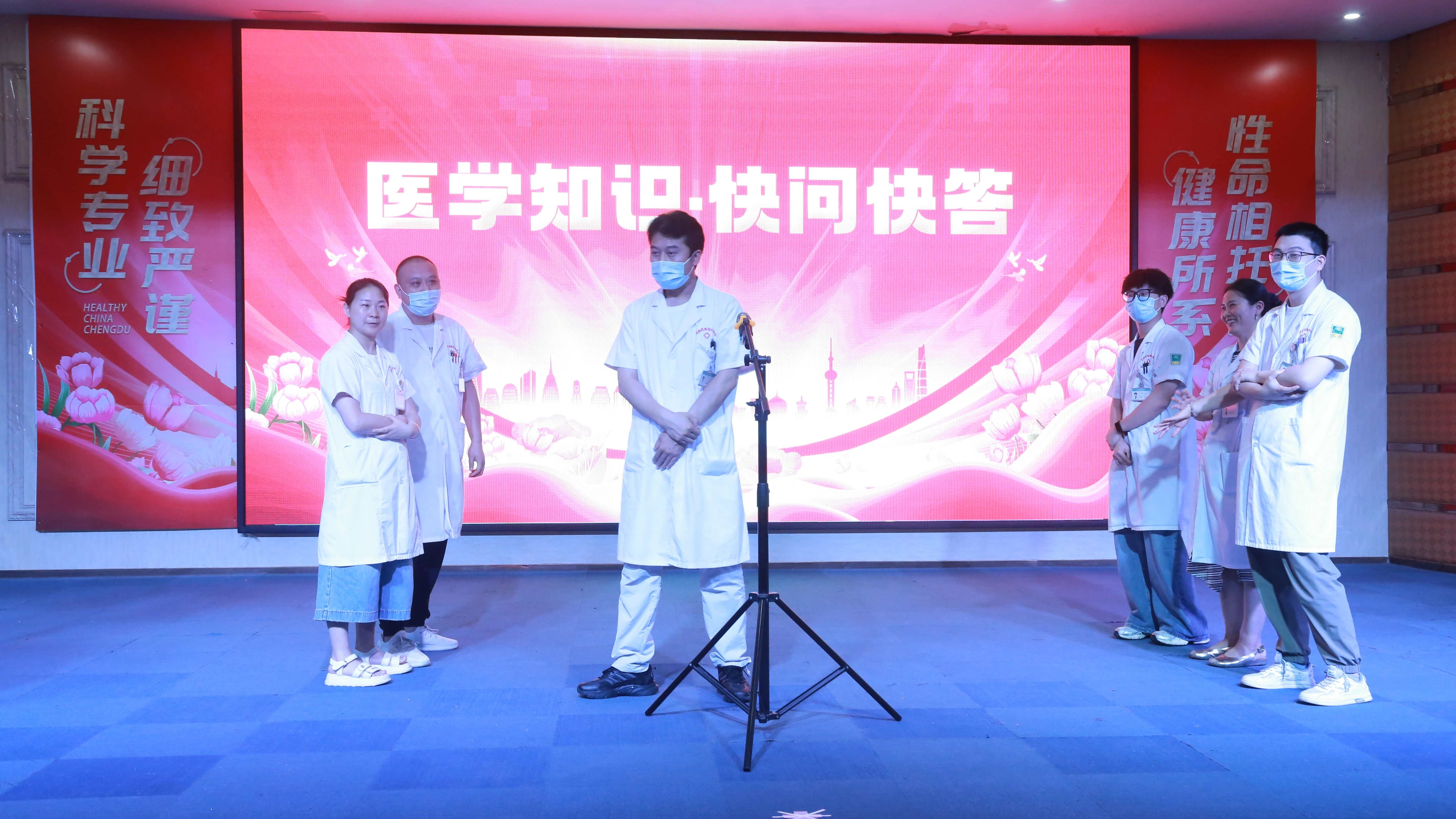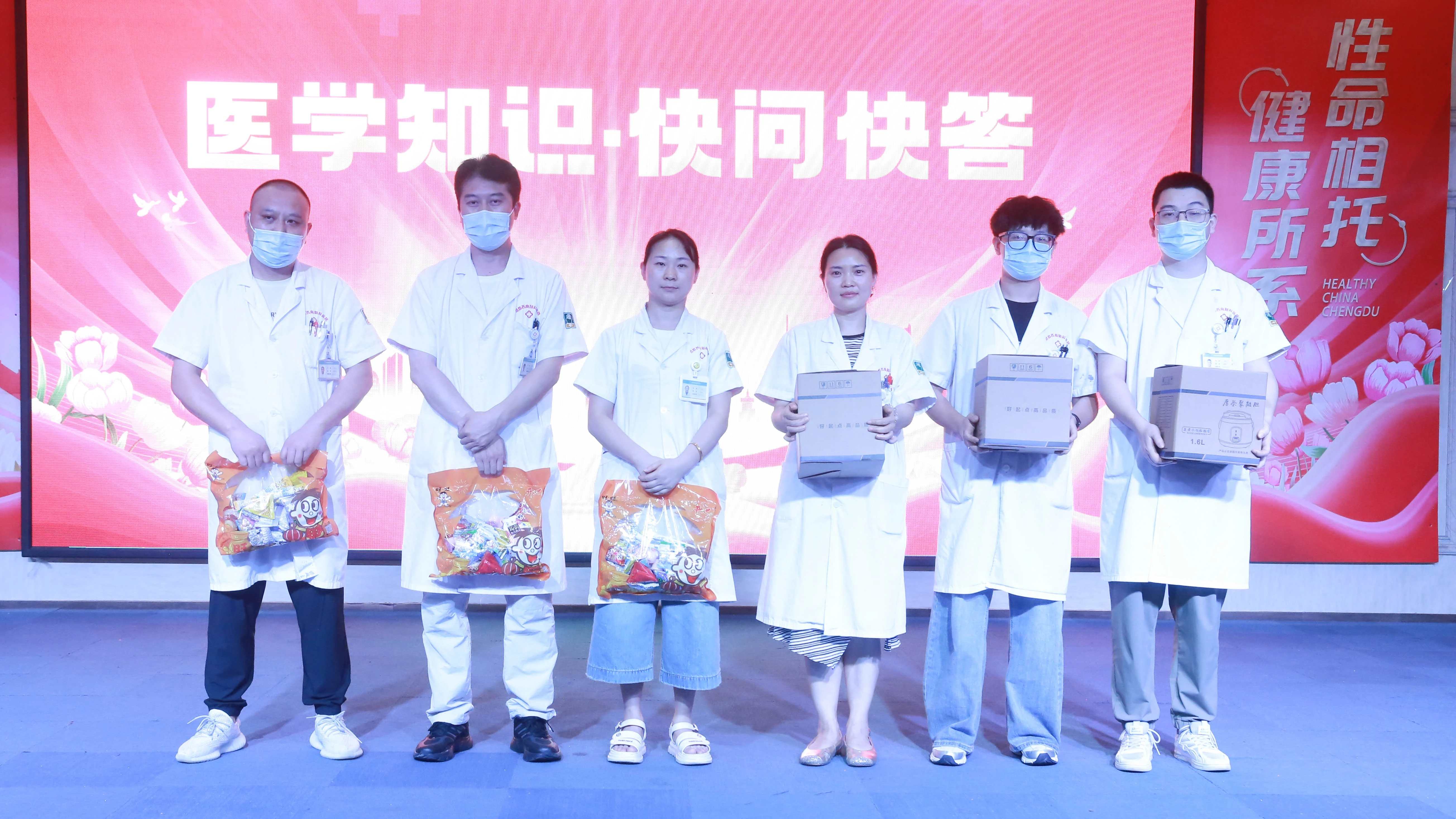 最后,医院还为大家准备了游戏环节,重在参与,不论输赢都有礼品。由一病区和三病区各派3位医生代表上台,台上一支话筒,由主持人念题,医生们抢到话筒后必须在5秒内作答,每队2次现场求助机会,求助时间30秒,最终三病区险胜。