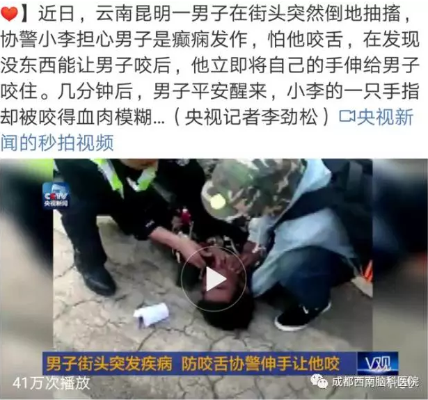 @央视新闻 报道了昆明一男子疑似癫痫发作倒地抽搐,由于担心患者咬舌勇敢的协警把自己的手给他咬。这种做法十分勇敢,协警小哥好样的。但是,这种把手塞进嘴里的急救方法是错误的,既损伤患者也损伤施救者,更有传染疾病的风险,不应提倡和扩散。