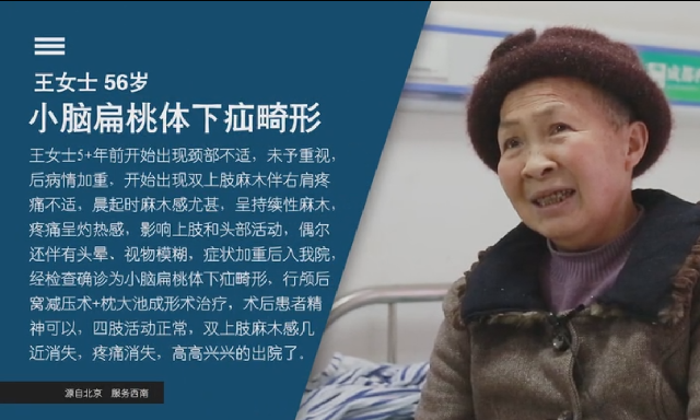 麻木疼痛的时候偶尔还伴有头晕、视物模糊,症状加重后入我院,经检查确诊为小脑扁桃体下疝畸形。