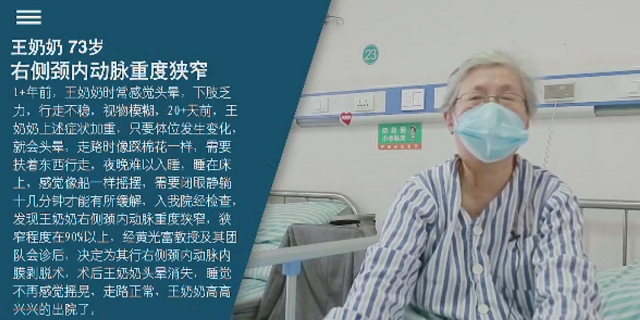 这是一对清华大学毕业的学霸夫妇,一年多以前,王奶奶时常感觉头晕,下肢乏力,行走不稳,视物模糊。二十多天前,王奶奶上述病情加重,只要体位发生变化,就会感到头晕。王奶奶反应她走路时像踩棉花一样,需要扶着东西才能行走。夜晚也难以入睡,躺在床上,感觉像躺在船上一样摇摆,需闭眼十几分钟才能有所缓解。于是王奶奶在她老伴的陪同下来到我院治疗,检查发现,王奶奶右侧颈动脉重度狭窄,狭窄程度在90%以上。后经黄光富教授及其团队会诊后,决定为王奶奶实施右侧颈动脉内膜剥脱术。