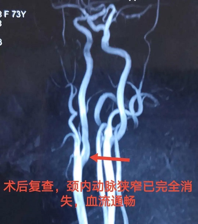 术后第五天,磁共振血管造影(MRA)复查结果,显示原颈内动脉起始段重度狭窄处已经恢复通畅。
