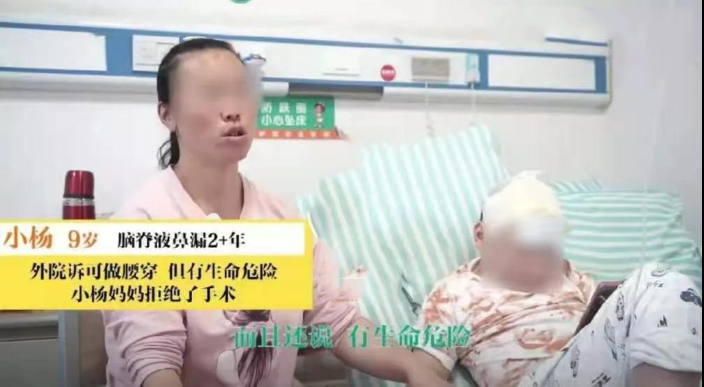 小杨今年9岁,2+年前从床上摔下,在贵阳某院以“化脓性脑炎”治疗,后发现有脑脊液鼻漏,但当地条件限制只能做腰穿治疗,可能会有生命危险,小杨妈妈拒绝了手术。