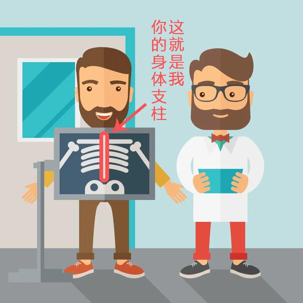 作为人体的中轴骨骼,我是你的支柱,具有负重、减震、保护和运动等功能。同时,我还指挥着身体各部门的协调机制,即使上肢兄弟举了百余斤的重物,我仍然能保持平衡。