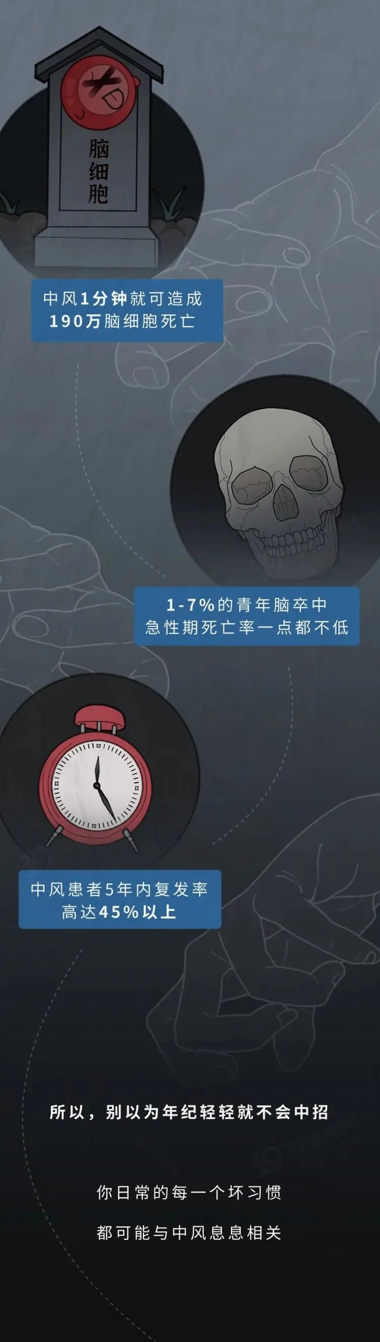 对年轻人来说,要认识到脑卒中不是老年人的专属,年轻人也一样有患病风险。建议40岁以下的青年人群也要定期体检,看有没有高血压、高血脂、高血糖,这都是脑血管病的危险因素。