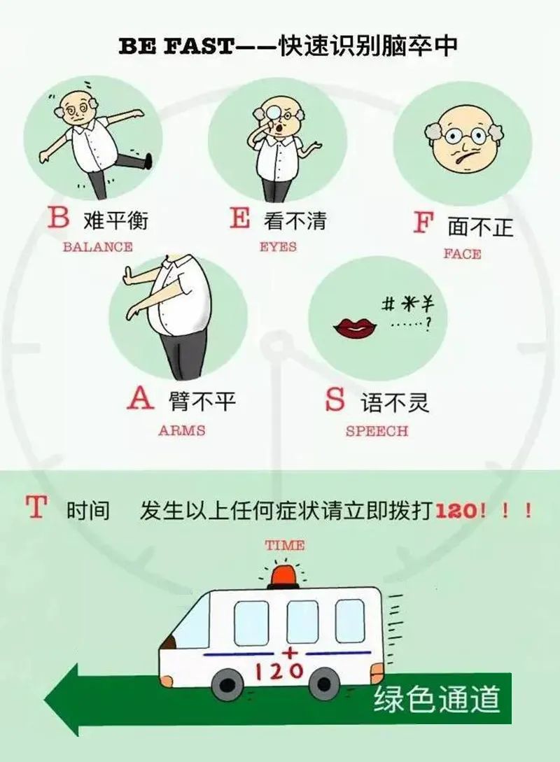 2021年7月,中国卒中学会在第七次学术年会期间正式发布了识别卒中早期症状的“ BE FAST口诀 ”,前5个字母各代表一个早期症状,最后1个字母是提醒一旦发现卒中症状,就要马上拨打急救电话,立刻就医: