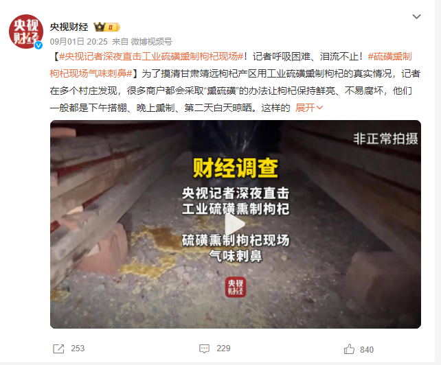 去年今日,有央视记者通过暗访发现,在青海格尔木市以及甘肃靖远县等枸杞原产地,存在枸杞熏硫的乱象。