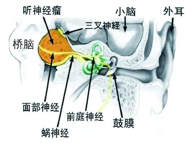 听神经瘤是起源于听神经鞘的肿瘤,为良性肿瘤,是常见颅内肿瘤之一,占颅内肿瘤的7%~12%。多见于成年人,高峰在30岁至50岁。严格意义上讲,该肿瘤并非来源于听神经,而是来源于与之非常靠近的神经——前庭神经。由于听神经与前庭神经紧紧地挨在一起,因此前庭神经上的肿瘤长大后,就会压迫到比较脆弱的听神经,患者会感到听力下降,包括出现耳鸣。