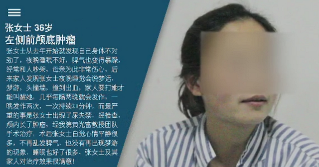 后来家人发现张女士睡觉会说梦话,梦游,甚至头撞墙,撞到出血,家人要打她才能叫醒她。几乎每隔两晚就会发作,一晚发作两次,一次持续20分钟,而较严重的事是张女士出现了尿失禁!经检查,颅内长了肿瘤。