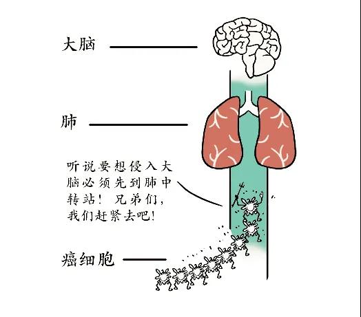 有学说认为,其他癌症发生脑转移也要走肺这条“绿色通道”:肿瘤细胞先经肺循环转移到肺,再经体循环转移到脑。
