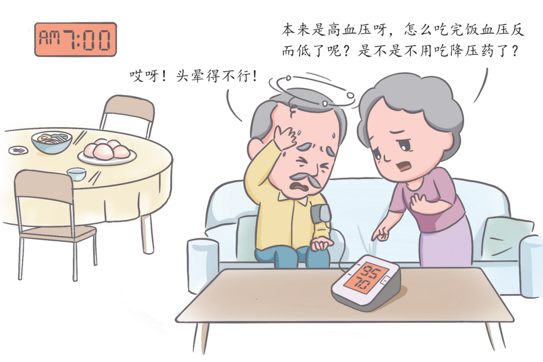 餐后低血压是老年高血压患者容易发生的情况,患病率达36%~70%。一日三餐中,早餐后出现餐后低血压的概率最大,多发生于餐后 1~2 小时。